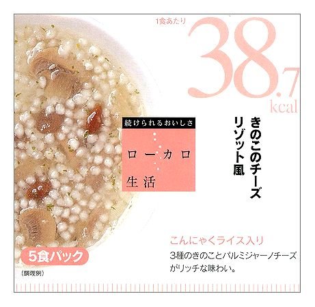 原材料/こんにゃく、具(マッシュルーム、しめじ、チキンエキス、なめこ、パセリ)、米、ナチュラルチーズ、コンソメ、ローストオニオン、食塩、チキンエキス、調味料(アミノ酸等)、酸化防止剤(V・E)、香辛料抽出物、クチナシ色素、酸味料(原材料の一部に大豆、小麦を含む)