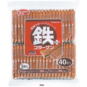 1枚あたり鉄2.5mgとコラーゲン100mgとカルシウム100mgを配合しました。やさしいココア味タイプの健康サポートウェハースです。