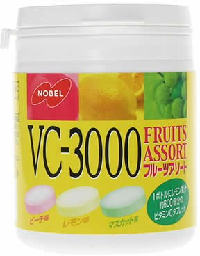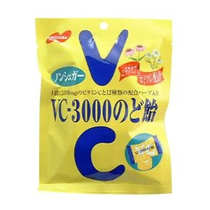 ノーベル VC-3000のど飴は、1袋に3000mgのビタミンCとエキナセア・カミツレなど12種類のハーブを配合、爽やかなノンシュガーのど飴。